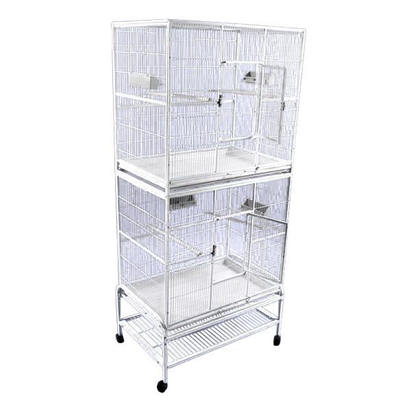 A & E Cage Company Double Stack Flight Bird Cage Great cage for small birds that love to fly, giving them the wing space they need to stay happy and healthy. Two cages in one! A must-have for bird breeders or those that want to have multiple birds but don't have the floor space. Features:Bird proof front door and feeder door locks. Stand includes shelf for storage. Slide out metal grill and plastic tray. Vertical bars. Includes 4 wood perches. 2 large front doors for easy access. 4 plastic feeding station; 2 on each level. 2 breeder doors. 4 easy rolling casters. … Read more